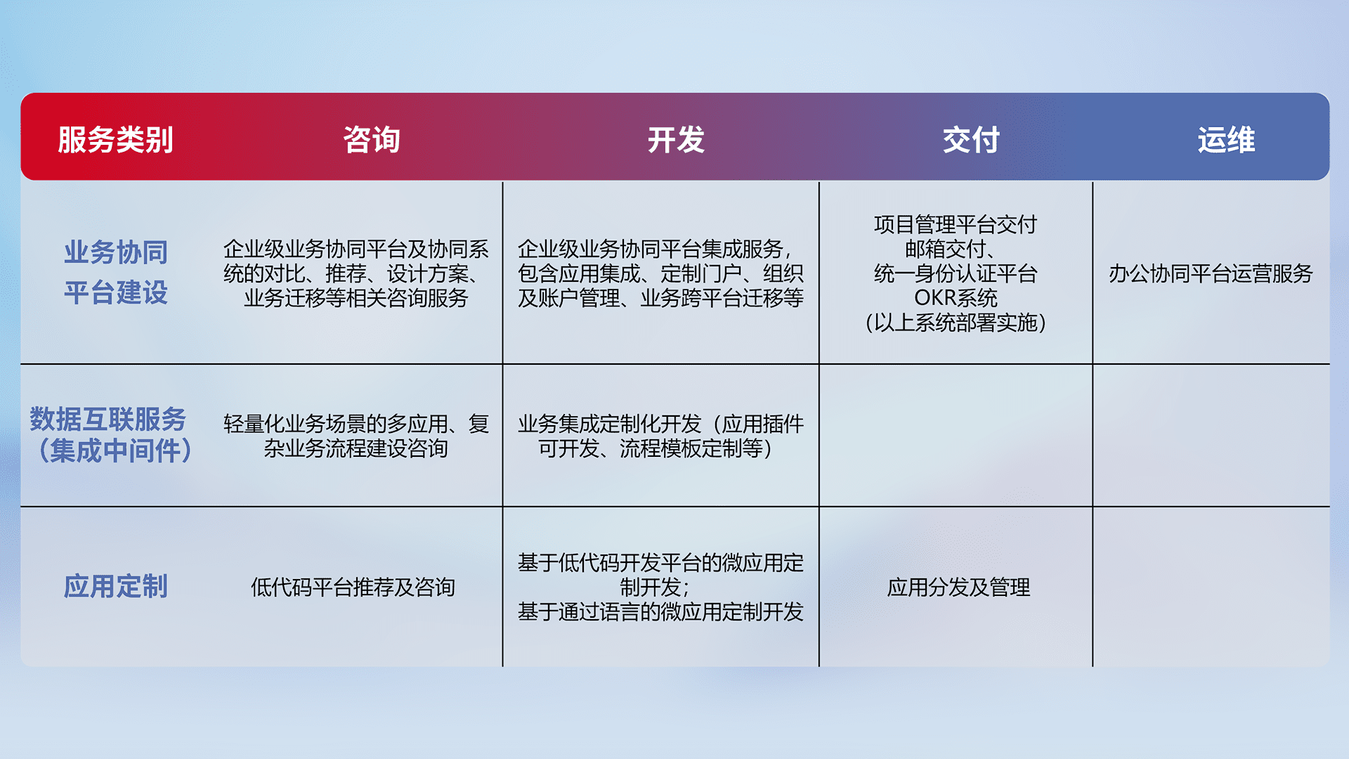 针对钉钉、、、企微、、IDaas等平台级产品提供产品的规划、、、、方案、、、、交付、、定制化开发等服务,,,实现如统一协同办公、、、智能客户服务、、、、混合会议管理、、、智能数据查询、、、等业务场景,,实现数字化转型。。。