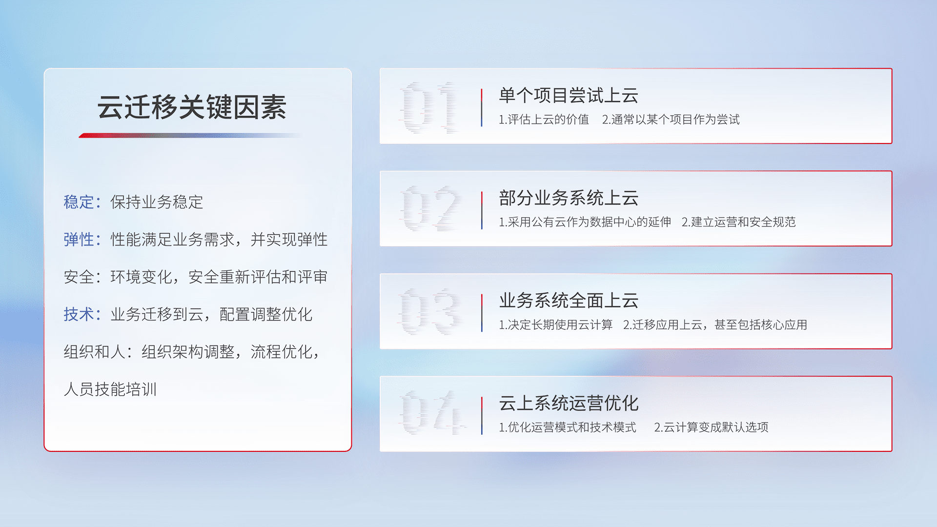 结合实际业务,,从规划设计、、云平台选型、、、云原生改造、、、、数据迁移、、、、集成交付,,迁移全过程为客户识别最佳上云路径,,,,做好风险识别管理,,,,设计网络架构、、、身份权限、、安全审计合规、、、操作审计、、日志审计、、、、监控告警策略、、、多站点容灾设计等,,对云上基础设施进行整体规划,,,提升IT治理水平,,以满足弹性、、、、高可用、、、高性能的需求。。