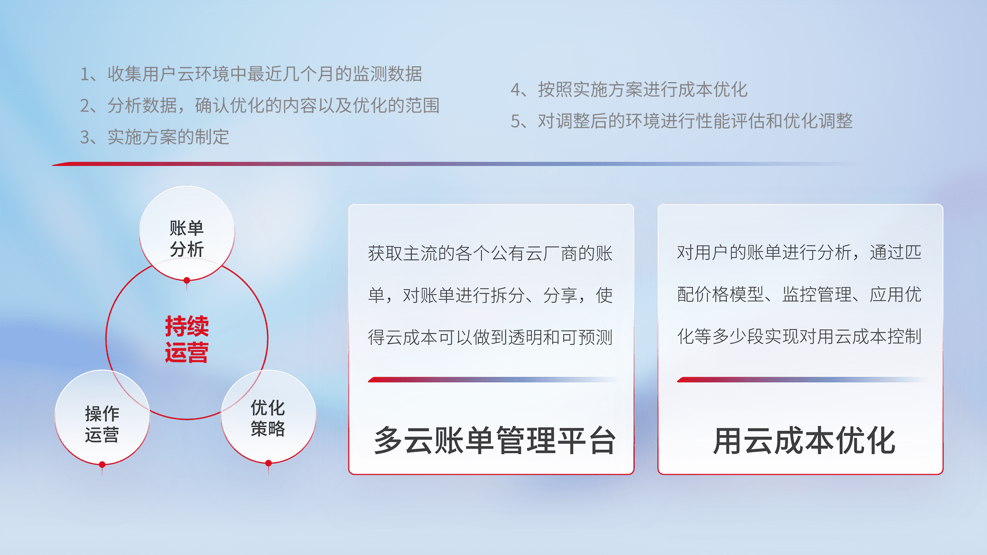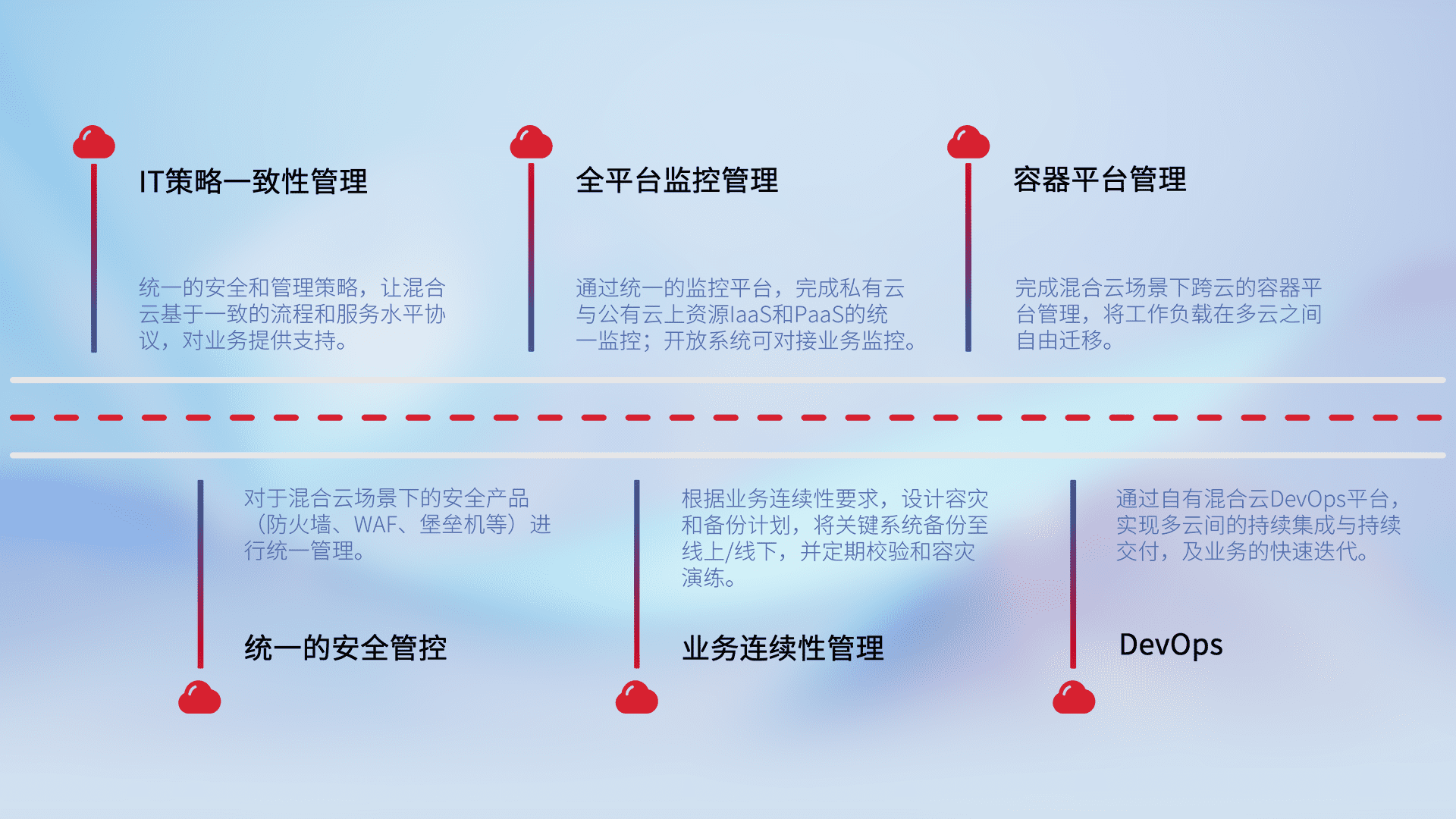 通过多云纳管,,,以统一的资源数据模型把客户的云资源进行抽象和封装,,,进而实现对多云资源的统一操作,,,,保障云资源管理的可靠性、、、、稳定性与可用性。。。。量身定制化运维内容,,,,配置、、、开发运维、、、、补丁管理、、、备份、、监控、、、、认证和访问管理、、、、审计和日常巡检等,,,,保障在用云过程中的可靠度,,,,稳定度以及高可用率。。。。