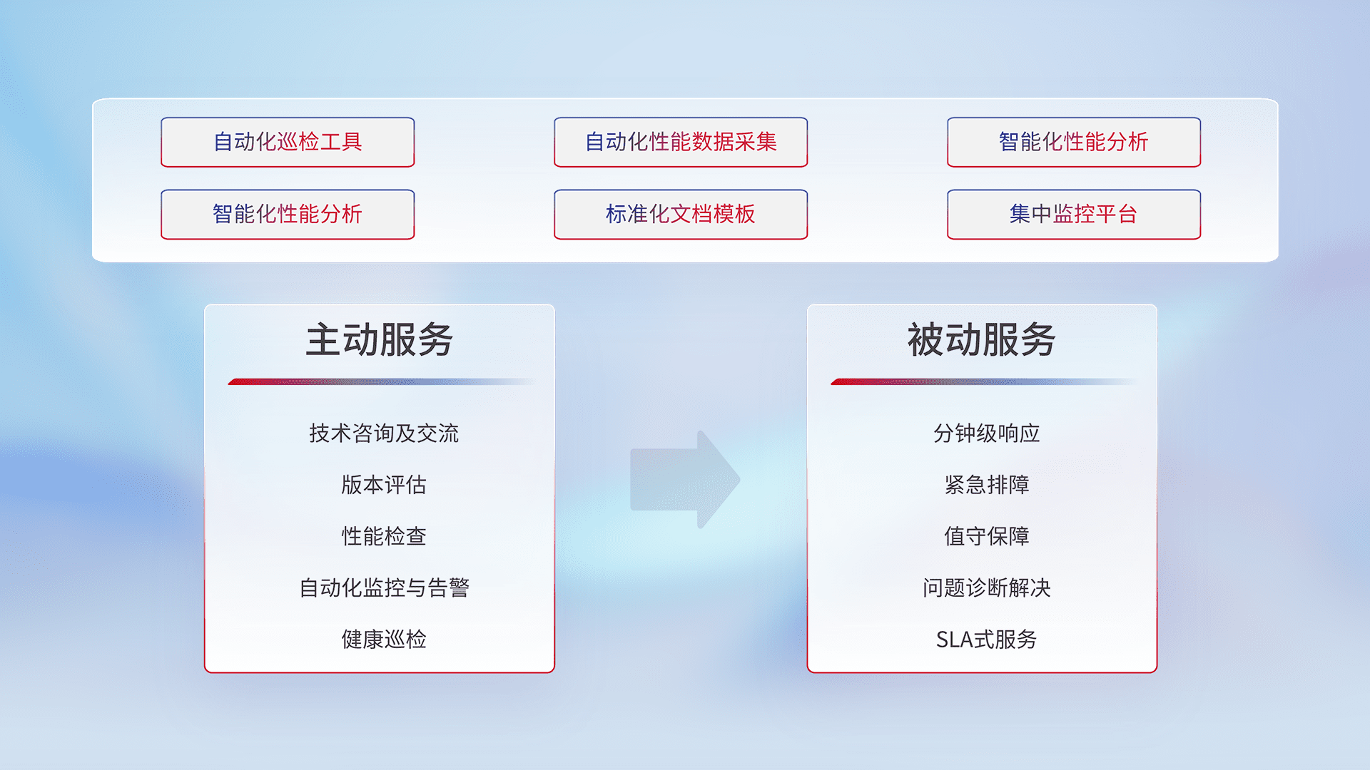 智能化工具和标准化文档,,,保障服务质量,,,提供主动服务(包含技术咨询、、、版本评估、、、、性能检查、、、自动化监控与告警、、健康巡检)和被动服务包含(分钟级响应、、紧急排障、、、值守保障、、、、问题诊断解决、、、SLA服务)。。